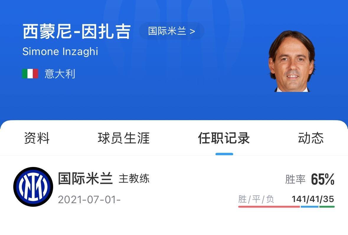 小因扎吉现年49岁,意大利籍教练,他于2021年夏天成为国米主帅,带队至今小因扎吉带领球队赢得1座意甲、两个意大利杯、三个意大利超级杯。